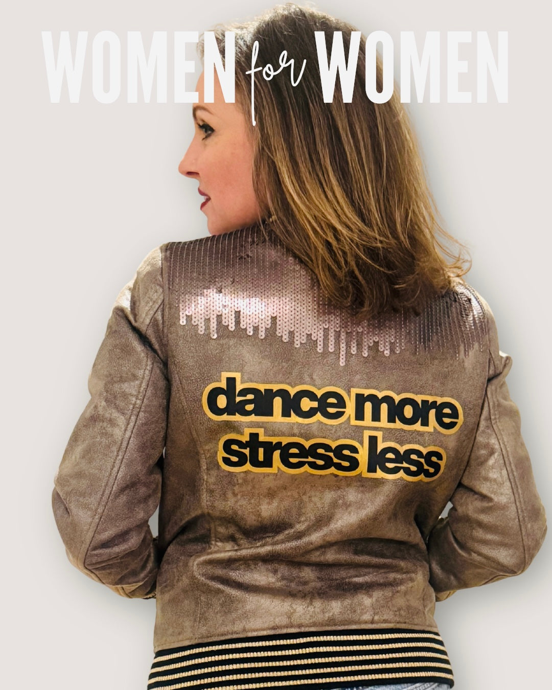 Der Rücken wurde kunstvoll mit einem DTF-Druck in Schwarz-Gold veredelt: “Dance more, stress less.”