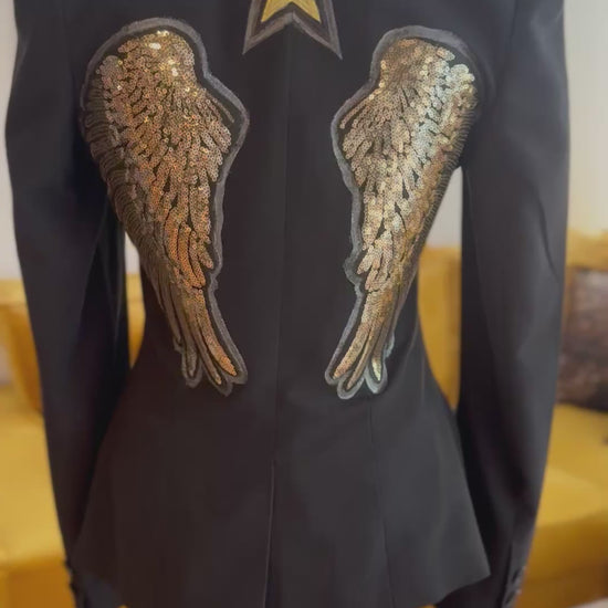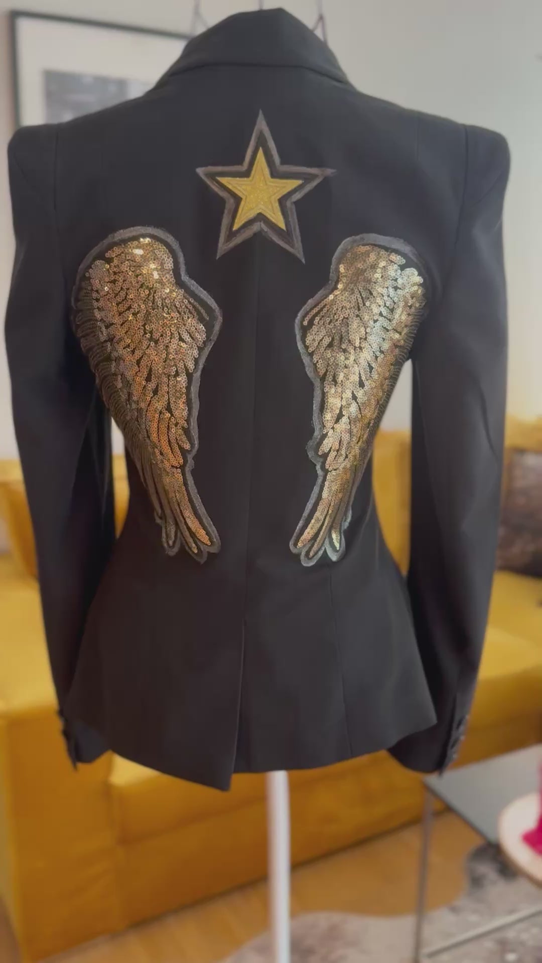 Den Rücken zieren goldene Engelsflügel, mit silberner Farbe akzentuiert.
